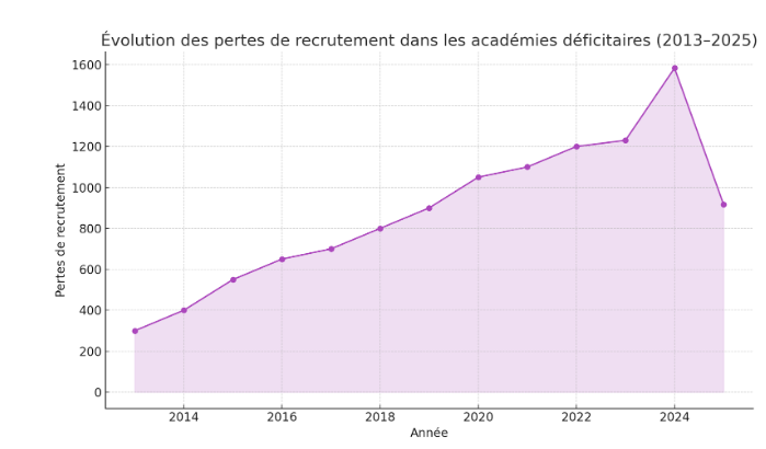 Depuis 2013, les académies déficitaires cumulent plus de 11 800 postes non pourvus, un chiffre qui révèle une dégradation profonde et structurelle de l’attractivité du métier et des inégalités territoriales très marquées.