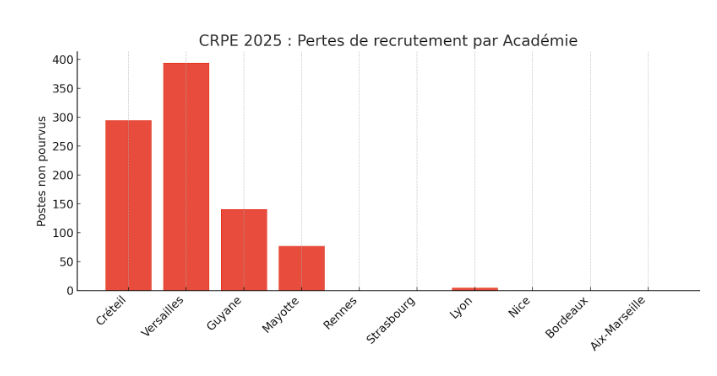 Avec 917 recrutements manqués cette année (contre 1583 en 2024), on pourrait croire à une embellie. Mais cette baisse n’est que mécanique : elle découle de la réduction du nombre de postes ouverts dans les académies déjà en tension, comme Créteil, Versailles ou la Guyane. Moins de postes proposés, c’est mathématiquement moins de postes non pourvus… Mais la crise de recrutement perdure.