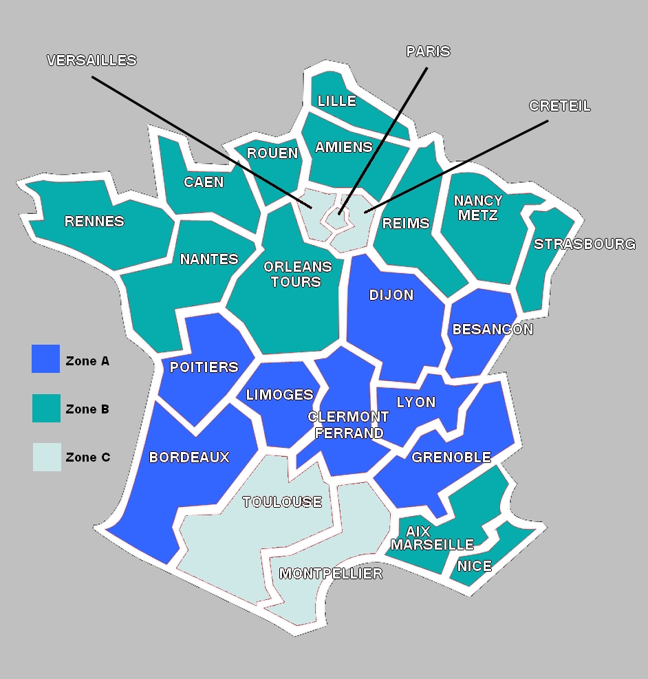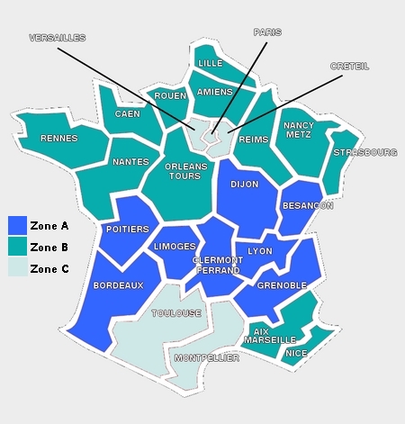 - Zone C : Créteil, Paris, Versailles, Montpellier, Toulouse