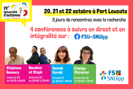 L’Université d’Automne de la FSU-SNUipp qui s’est tenue du 20 au 22 octobre à Port Leucate a, une fois encore, affiché complet. Plus de 400 participantes et participants sont venu·es rencontrer, lors d’ateliers et de conférences, des chercheurs et des chercheuses pour échanger autour des questions de métier.